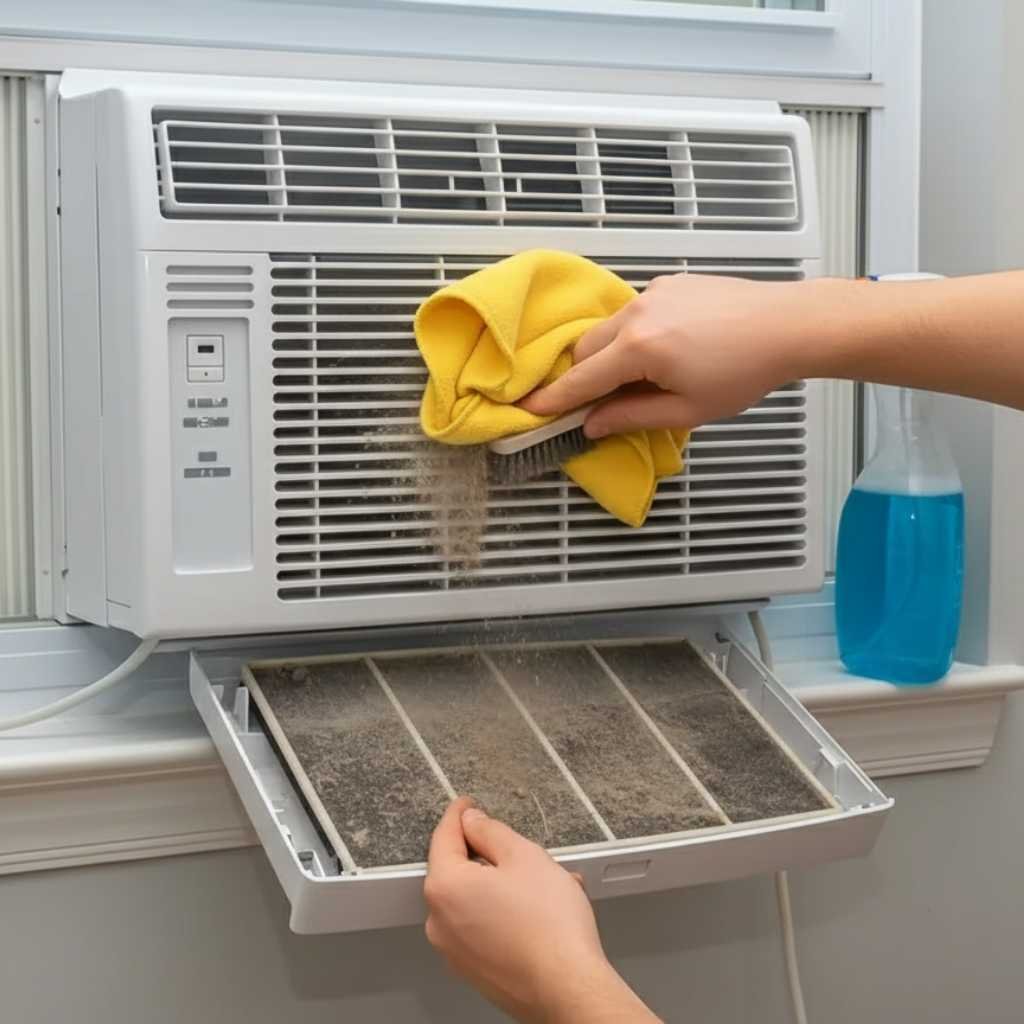 Window AC foam jet deep cleaning to remove deep dust, fungus and odour. Includes indoor coil and blower foam wash plus outdoor condenser jet cleaning if accessible. Improves cooling, airflow and power efficiency.